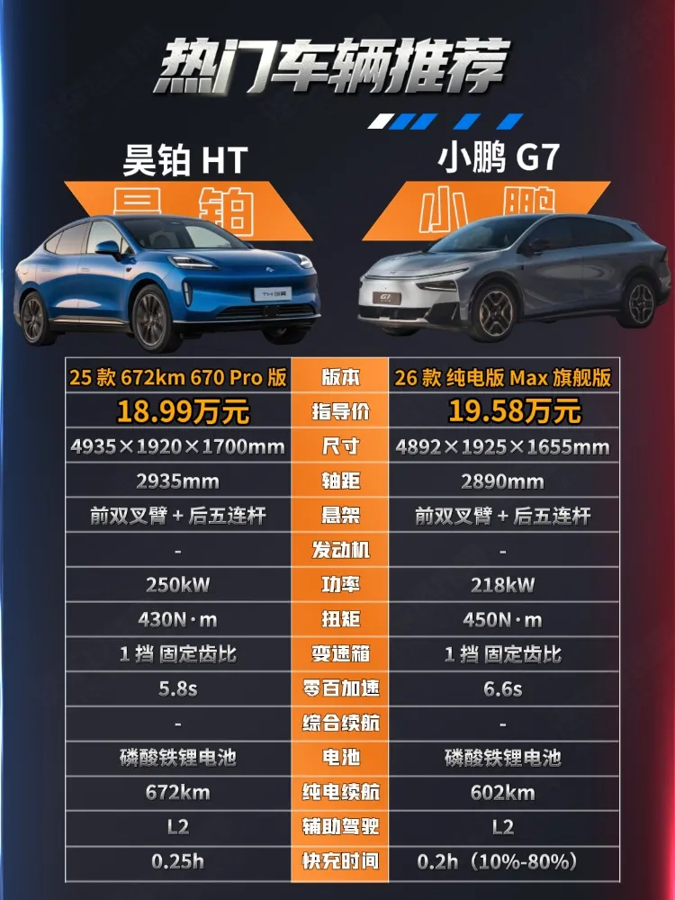 昊铂HT 2025款670 Pro版售价为18.99万元,小鹏G7 2026款纯电602Max旗舰版售价为19.58万元,两款车均为纯电车型,售价也比较接近,同时都以家庭用户为主要目标用户,那么如果是你更喜欢哪款车呢?