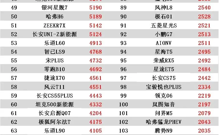 • 尾部惨淡车型:风神L7、极石01、小鹏G7、岚图知音等车型销量仅有2千多辆;豹8、捷途自由者、小鹏G9、红旗HS7 PHEV等车型表现更是“拉胯”,排名均在100名开外,月销量仅千辆出头,在激烈的市场竞争中几乎沦为“边缘车型”。