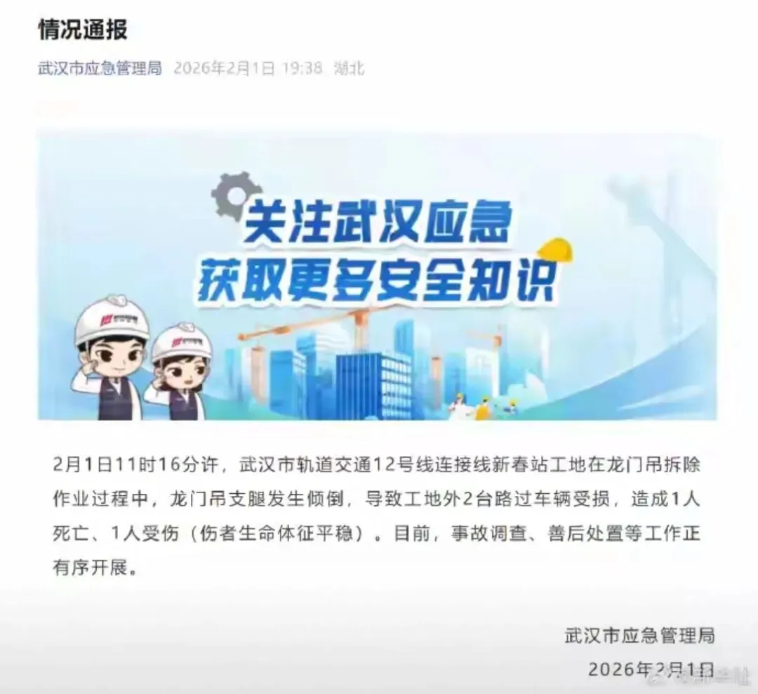 晚上19时38分,根据武汉市应急管理局的通报,该起事故最终造成了1人死亡,1人受伤。