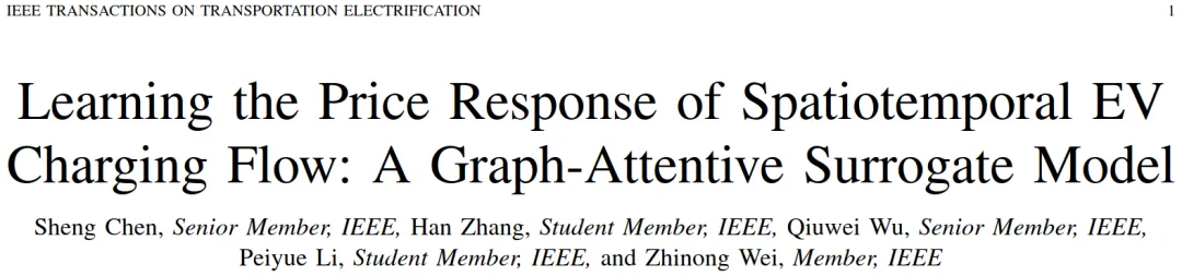 S. Chen, H. Zhang, Q. Wu, P. Li and Z. Wei, "Learning the Price Response of Spatiotemporal EV Charging Flow: A Graph-Attentive Surrogate Model," in IEEE Transactions on Transportation Electrification, doi: 10.1109/TTE.2026.3657374.