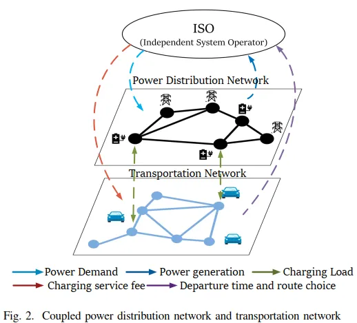 🔹 交通网络(TN)与配电网(PDN)深度耦合充电站既是交通节点,也是电力负荷节点,局部拥堵往往伴随局部电压越限。