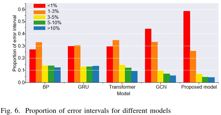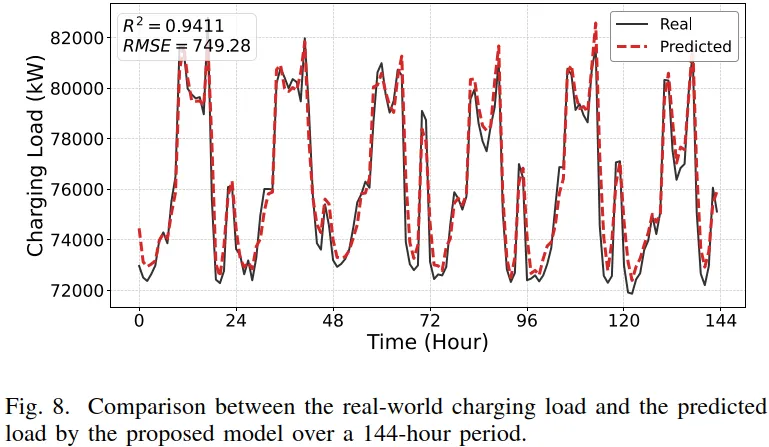 为验证模型在真实场景下的适用性,研究进一步引入了南京市 5 个公共快充站的实测运行数据进行测试。图 8 展示了模型在 144 小时时间尺度上的充电负荷跟踪结果,可以看到预测曲线与真实负荷变化高度一致。即便在用户行为不确定性较强、负荷波动剧烈的情况下,模型仍能较好捕捉高峰时段的快速爬坡以及低谷时段的波动特征。这一结果表明,该模型已有效学习到价格信号与充电需求之间的非线性关系,具备支撑交通–电力耦合系统在线调度与实际应用的可靠性。