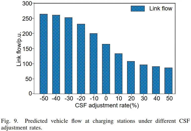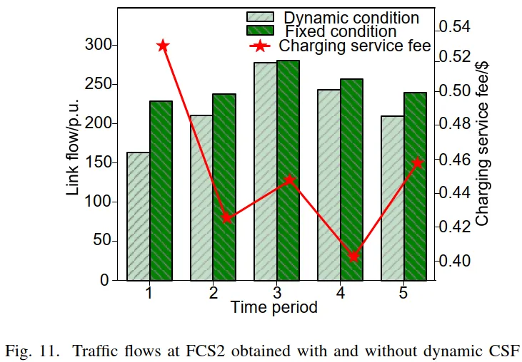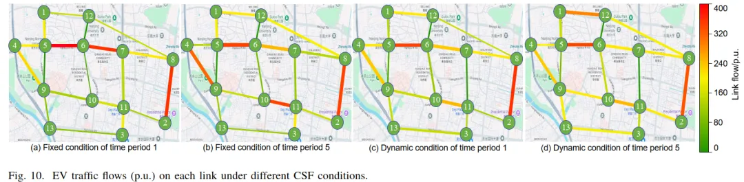 通过对比固定充电服务费(CSF)与动态 CSF两种情形下的运行结果,图 10–12 系统展示了动态定价对交通网络与配电网的引导作用。