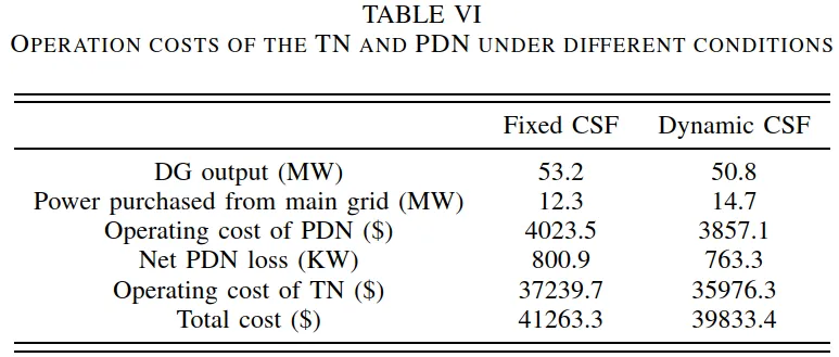 表 VI 从整体经济性的角度量化了动态充电服务费策略的收益。结果显示,引入动态 CSF 后,系统总社会成本降低约 3.5%。其中,在配电网侧,通过平滑充电负荷分布,运行成本下降约 4.1%,网损降低约 4.7%;在交通网络侧,由于车辆被引导至拥堵程度较低的充电站,用户的综合出行成本降低约 3.3%。这一结果表明,动态充电定价不仅提升了电网运行效率,也改善了交通系统的均衡性,从而实现了交通–电力耦合系统的整体经济优化。
