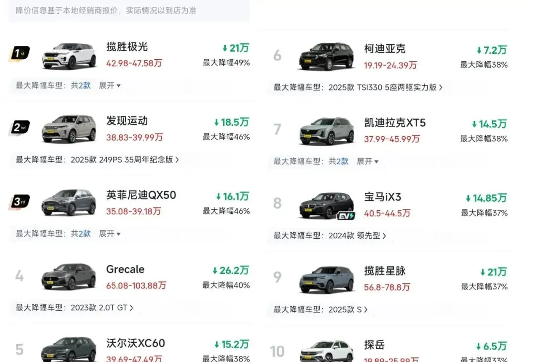 2026年市场数据太扎心:中型SUV价格普遍下调20%以上,豪华品牌如揽胜极光降幅50%,沃尔沃XC60、凯迪拉克XT5优惠35%+。品牌溢价?早被削成渣了。消费者就认仨字:值不值。