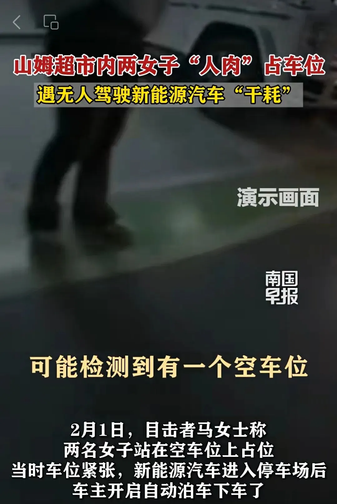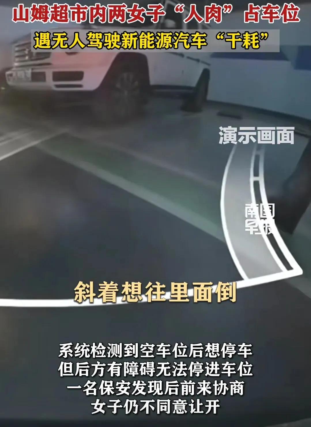 两名女子占着一个空车位等自家车来,随后,一辆自动泊车的新能源车看上了这个车位,要停进来。车要进,人不让,机器按程序走,人按自己的想法站,就这么僵住了。