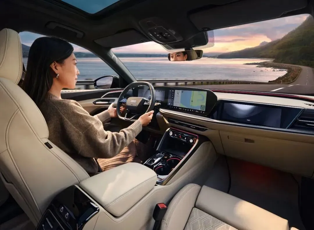如果说外观和动力是常规升级,那么科技配置的进化堪称"颠覆性"。全新奥迪Q5的内饰彻底告别了上一代的传统布局,采用了全新的智能座舱设计。最吸睛的是三屏联动布局:11.9英寸全液晶仪表盘、14.5英寸中控触摸屏,以及10.9英寸副驾驶娱乐屏(部分高配车型),配合HUD抬头显示和手机互联,实现了真正的五屏联动。这套系统基于新一代MMI系统,支持5G-V2X车路协同、3D城市建模导航,并集成了GPT-4语音助手,识别准确率和响应速度都有明显提升。