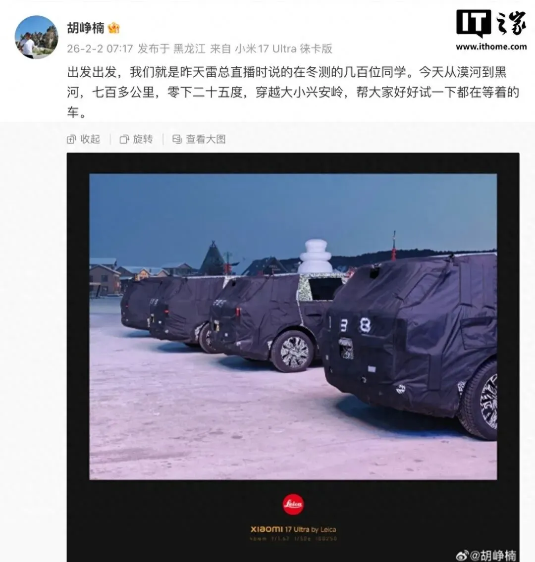 最近小米汽车又有新动作!顺为资本投资合伙人胡峥楠在微博上晒出了一组伪装测试车的实车图,4台SUV身披伪装从漠河穿越到黑河,在零下25度的严寒中完成了700多公里测试,其中就有大家期待已久的小米首款增程SUV(暂称YU9)。作为小米计划在2026年推出的大型D级混动SUV,这款车从2024年11月谍照曝光后,更多核心信息逐渐浮出水面,今天就用大白话给大家拆解它的亮点。