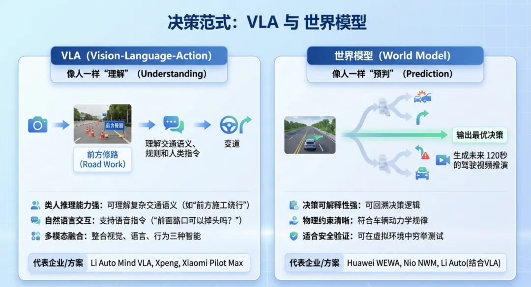 VLA(Vision-Language-Action)让机器不仅看懂“前方有车”,还能理解“减速避让”的语义,并直接输出方向盘、刹车的执行动作。小鹏、理想走的是这条路。