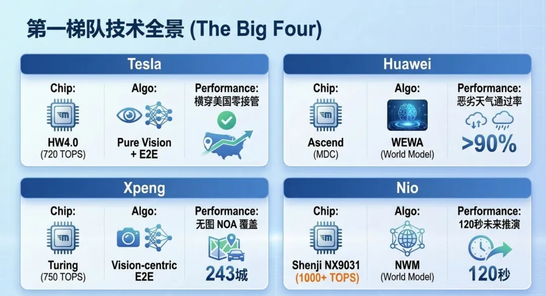 主车厂正在形成“算力+模型+软件栈”的完整生态。蔚来神玑NX9031已上车ET9,1000 TOPS算力;小鹏图灵AI芯片上车G7,750 TOPS;理想M100预计2026年上车;吉利星辰一号512 TOPS。自研芯片成为头部车企的标配。特斯拉、小鹏、华为及蔚来基本站稳自动驾驶第一梯队。