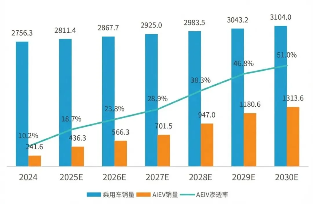2024-2030E中国乘用车及AIEV销量及渗透率预测(万台)