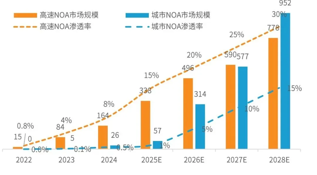 一是价格下探。 2023年城市NOA(NOA,Navigate on Autopilot,即自动辅助导航驾驶,城市NOA属于ADAS高级驾驶辅助系统到完全自动驾驶的中间过渡阶段)主要搭载在30万元以上车型(理想L系列、蔚来ET7、小鹏G9),2024年下探至20-25万元区间(小鹏P7i、智己LS6、问界M7),2025年进一步下探至15万元左右(小鹏MONA M03标配城市NGP、比亚迪海豹06搭载DiPilot)。从“高端车专属”到“全价位段普及”,硬件预埋+软件订阅模式扩大了装车基数。