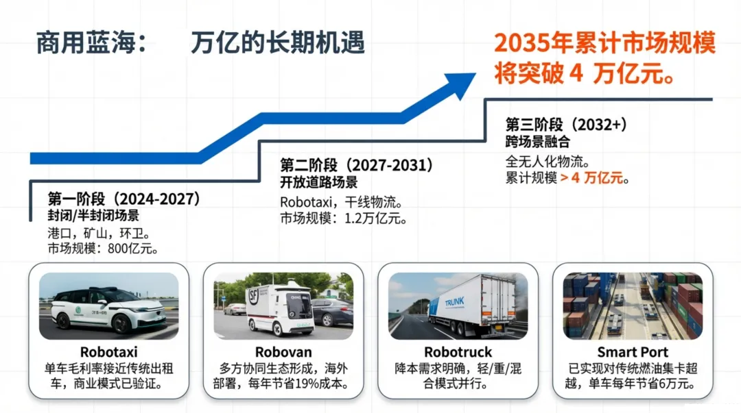 2032年后:跨场景融合应用“一条链路、多场景联动”,比如从港口无人集卡,前往高速干线物流,再通过城市末端配送的全程无人化;矿山无人矿卡,通过干线运输到达工厂园区配送,全链条物流智能化管理。预计到2035年将达到每年净增规模4-8亿元。