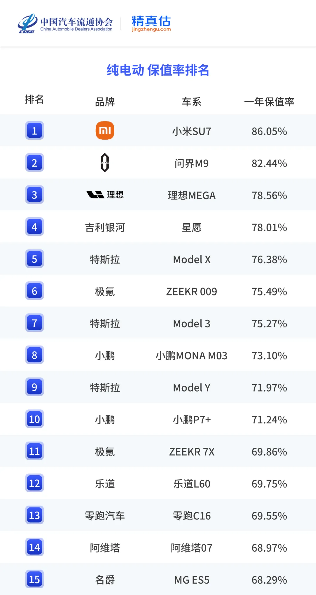 在纯电动车型中,小米SU7以86.05%的一年保值率获2025年度保值率第一名,问界M9同样在80%以上,一年保值率为82.44%,仅次于小米SU7,排名第三的是理想MEGA,一年保值率为78.56%。此外,吉利银河星愿(78.01%)、特斯拉Model X(76.38%)、极氪009(75.27%)、特斯拉Model 3(75.27%)、小鹏MONA M03(73.1%)、特斯拉Model Y(71.97%)、小鹏P7+(71.24%)均跻身前十。