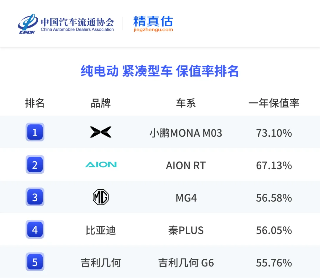 纯电动紧凑型车中,小鹏MONA M03一年保值率为73.10%,埃安AION RT为67.13%,其他车型包括名爵MG4、比亚迪秦PLUS、吉利几何G6均低于60%。纯电动中型车中,特斯拉Model 3一年保值率为75.27%,五菱星光、荣威D7、深蓝L07、比亚迪海豹也均在60%以上。