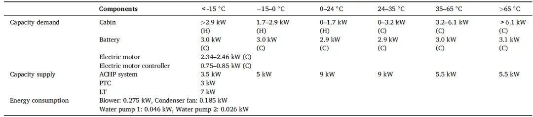 系统根据环境温度自动调节座舱温度,高于24℃时制冷,低于24℃时加热(表1中H和C分别代表加热和冷却)。ACHP系统性能受温度影响显著,可在不同温区间提供最大能量输出。电池、电机及控制器产生的热量相对稳定,温度变化对其影响较小。电池在正常运行时的散热需求约为3kW,快充时增至5kW。低温环境中,电池自身产热已可维持运行。PTC加热器最大功率为3kW,仅在空调系统无法满足座舱供暖需求时启用。