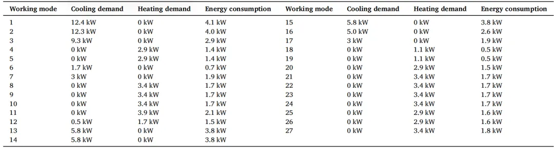 风机、冷凝器风扇及水泵1、2的能耗相对较低。系统的主要耗能部件包括座舱、电池、电机及电控器。通过模拟系统各部件的能耗,本研究根据热管理系统评估模式,梳理了27种不同工作模式下的能量交换情况。不同工作模式下的能耗如表2所示。