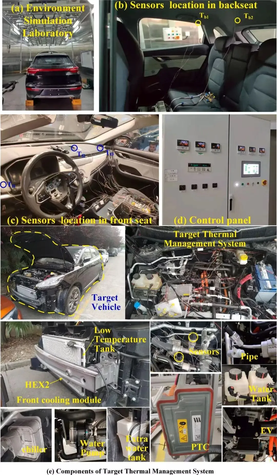 图5所示为实验过程中目标车辆内各个传感器点的分布情况以及目标车辆的真实车辆热管理系统的分布,包括换热器、PTC单元、水箱、膨胀阀、水泵等部件。