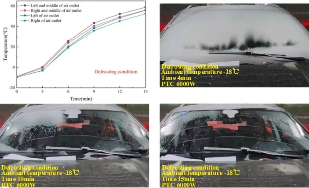 图8所示为环境温度为-18℃的除霜工况下,座舱温度随时间变化曲线。座舱出风口持续送出暖风,车内温度逐步上升。挡风玻璃的结霜面积随时间逐渐减小。实验初期结霜层完全覆盖挡风玻璃,4分钟后开始局部消融,10分钟后仅余少量霜层,15分钟时霜层完全消除。实验结果表明,该热管理系统除霜性能良好。