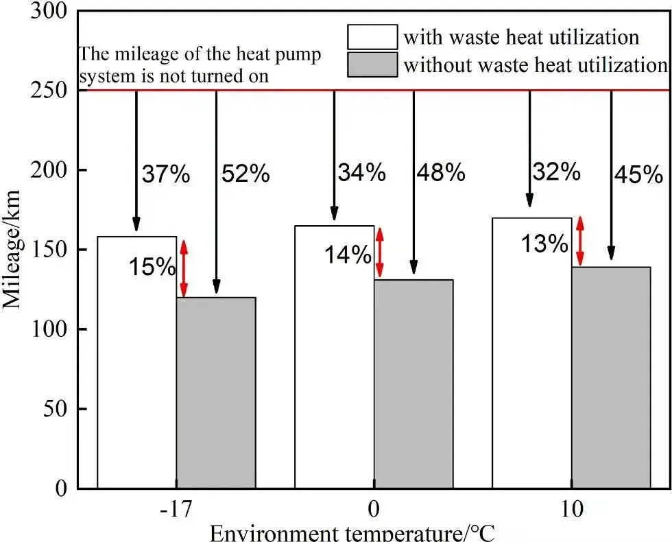 (4)与不回收余热的系统相比,余热利用蒸汽压缩热泵系统可有效节省电池电量,提高电动汽车的行驶里程。在−17℃、0℃和10℃的工作温度下,利用余热的热泵系统的行驶里程减少了32%~37%,而没有回收余热的热泵系统的行驶里程减少了45%~52%,且环境温度越低,这一差异越显著。
