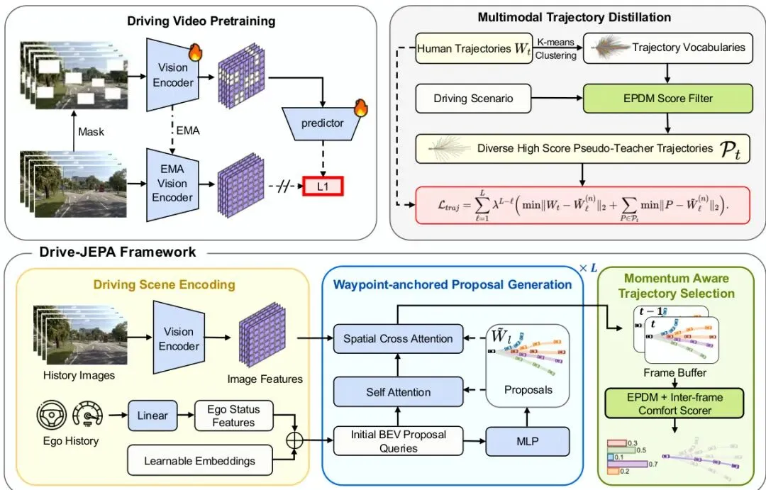 简单来说,Drive-JEPA做了一件很酷的事:它把视频预测学习和多轨迹知识蒸馏这两个招式,融进了一个端到端自动驾驶框架里。它的名字已经剧透了核心:Drive代表自动驾驶,JEPA则是它的第一个绝招——Joint-Embedding Predictive Architecture(联合嵌入预测架构)。这是一种自监督学习方法,不是让模型去费力地“画”出未来视频的每个像素(那太费算力了),而是让它学会预测未来画面的“本质特征”。这就好比不是预测下一帧照片的每个色彩点,而是预测“接下来画面里物体会怎么移动、场景会如何变化”这种高级信息。图2:Drive-JEPA的整体架构概览。核心分为三步:驾驶视频预训练学习一个强大的视觉编码器;路径点锚定方案生成模块在线产生多种轨迹方案;最后通过动量感知的轨迹选择模块,挑出最安全、最舒适的一条。框架的运作流程就像一位经验丰富的指挥官:首先,视觉编码器(ViT)像眼睛一样观察前方路况(单目摄像头就够了)。接着,规划器会一口气生成几十条可能的未来行驶轨迹(比如32条),这些轨迹方案覆盖了加速、减速、绕行等多种可能性。最后,一个打分器会评估每条方案的安全性、合规性和舒适度,并综合考量前后决策的连贯性,选出最优解来执行。核心突破一:用视频预训练教会模型“预测未来”