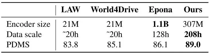 这就是V-JEPA的核心目标函数。简单说,就是让预测器Pφ根据编码器Eθ看到的画面(x),去预测目标编码器Eθ̄看到的画面(y)的特征。sg(·)代表“停止梯度”,θ̄是θ的滑动平均,这种设计能有效防止训练崩溃,学到的特征更稳定。这就好比在驾校里,教练把后视镜或部分车窗暂时遮住,让学员仅凭前方和侧方的有限信息,推断车身周围和后方的情况。长期这样训练,模型就学会了从动态序列中提取对未来规划最有用的时空特征,而不是死记硬背画面细节。论文作者们攒了一个长达208小时的大规模驾驶视频数据集,在这个数据集上对ViT编码器进行了V-JEPA预训练。效果有多明显呢?在完全不依赖任何感知标注(如3D框、车道线)的“纯规划”设定下,仅仅把这个预训练好的编码器,搭配一个轻量的Transformer解码器,就能取得惊人的效果。表1:与之前感知无关规划器的对比。可以看到,Drive-JEPA(Ours)在使用更少输入(仅前视相机)和可比的模型大小下,PDMS分数大幅领先。这充分说明了V-JEPA预训练学到的表征对于规划任务的有效性。核心突破二:向模拟器“偷师”,生成多模态驾驶方案