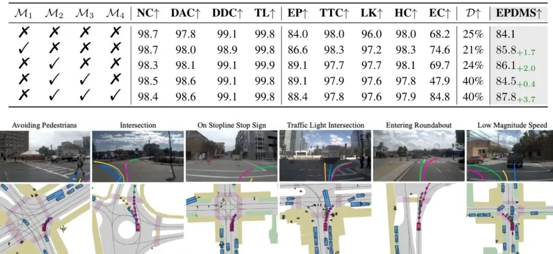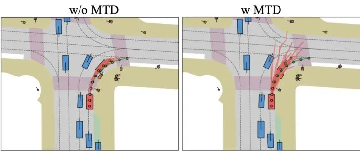 加入多模态轨迹蒸馏后,损失函数变为同时逼近人类轨迹和多个高质量的伪教师轨迹(P ∈ Pt)。λ是衰减因子,让模型在迭代后期更精细地调整。这个“多模态轨迹蒸馏”(Multimodal Trajectory Distillation, MTD)的妙处在于:它利用离线模拟低成本地获得了大量“如果…会怎样”的优质答案,从而让AI在学习时,见识了更丰富的驾驶可能性,决策时自然就更从容、更多元。图6:另一个视角的轨迹方案对比,再次验证了MTD对于防止模式坍塌、促进多模态分布的关键作用。核心突破三:引入“动量”思维,让驾驶决策更平滑舒适