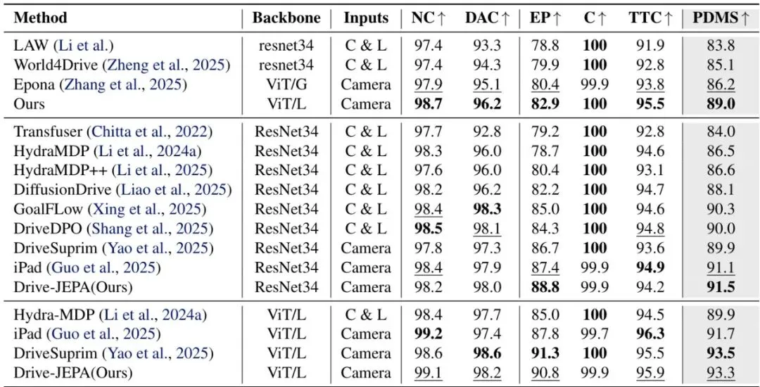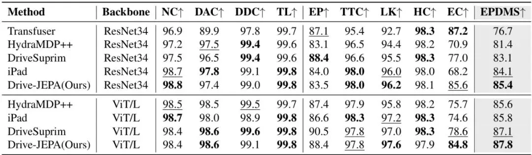 光说原理不够,是骡子是马得拉出来溜溜。Drive-JEPA在三个主流的自动驾驶基准测试上接受了检验。这是目前最受关注的开环规划评测基准。它不直接控制车辆,而是用模拟器来评估输出轨迹的质量。v2比v1的评估维度更细,加入了更多交通规则和舒适度指标。表2:在NAVSIM v1上的量化对比。Drive-JEPA在多种骨干网络(ResNet34, ViT/L)下都取得了领先或极具竞争力的成绩,尤其是在纯相机输入的设定下表现突出。表3:在更严苛的NAVSIM v2上的结果。Drive-JEPA(Ours)在最终的综合指标EPDMS上,无论是ResNet34还是ViT/L骨干,均取得了最佳成绩(87.8),创造了新的State-of-the-Art(SOTA)。特别值得注意的是,其在扩展舒适度(EC)这一项上优势明显,这直接体现了动量感知选择机制的有效性。这是一个在CARLA模拟器中进行的闭环评测基准,要求模型实时控制车辆完成复杂、交互性强的城市驾驶任务,更接近真实应用场景。表4:在Bench2Drive上的对比。Drive-JEPA取得了最高的驾驶分数(DS),并且在效率(Effi.)和成功率(SR)上表现也很出色。相比同为方案中心化(proposal-centric)方法的iPad,DS提升了4分,这验证了多模态轨迹蒸馏在复杂闭环交互中的价值。图4:不同模型在各种驾驶场景下(前视视角和鸟瞰视角)的轨迹定性对比。可以看到,Drive-JEPA生成的轨迹(绿色)更接近人类轨迹(红色),并且在复杂路口和变道场景下表现得更加合理、果断。实验结果充分说明,Drive-JEPA这套组合拳确实有效,不仅在精度上领先,在驾驶的多样性、安全性和舒适性上也取得了很好的平衡。未来展望与启发