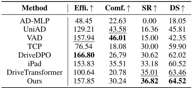 最终的得分由原安全分数(占7/8)和舒适度分数(占1/8)加权得到。这个权重参考了评测标准。这就好比一位老司机,在决定下一刻怎么开时,会自然而然地让动作承接上一个动作,而不是每次都从零开始做一个突兀的新决定。这个小小的设计,显著提升了乘坐的平滑感和舒适度。实验结果:多项基准测试刷新纪录