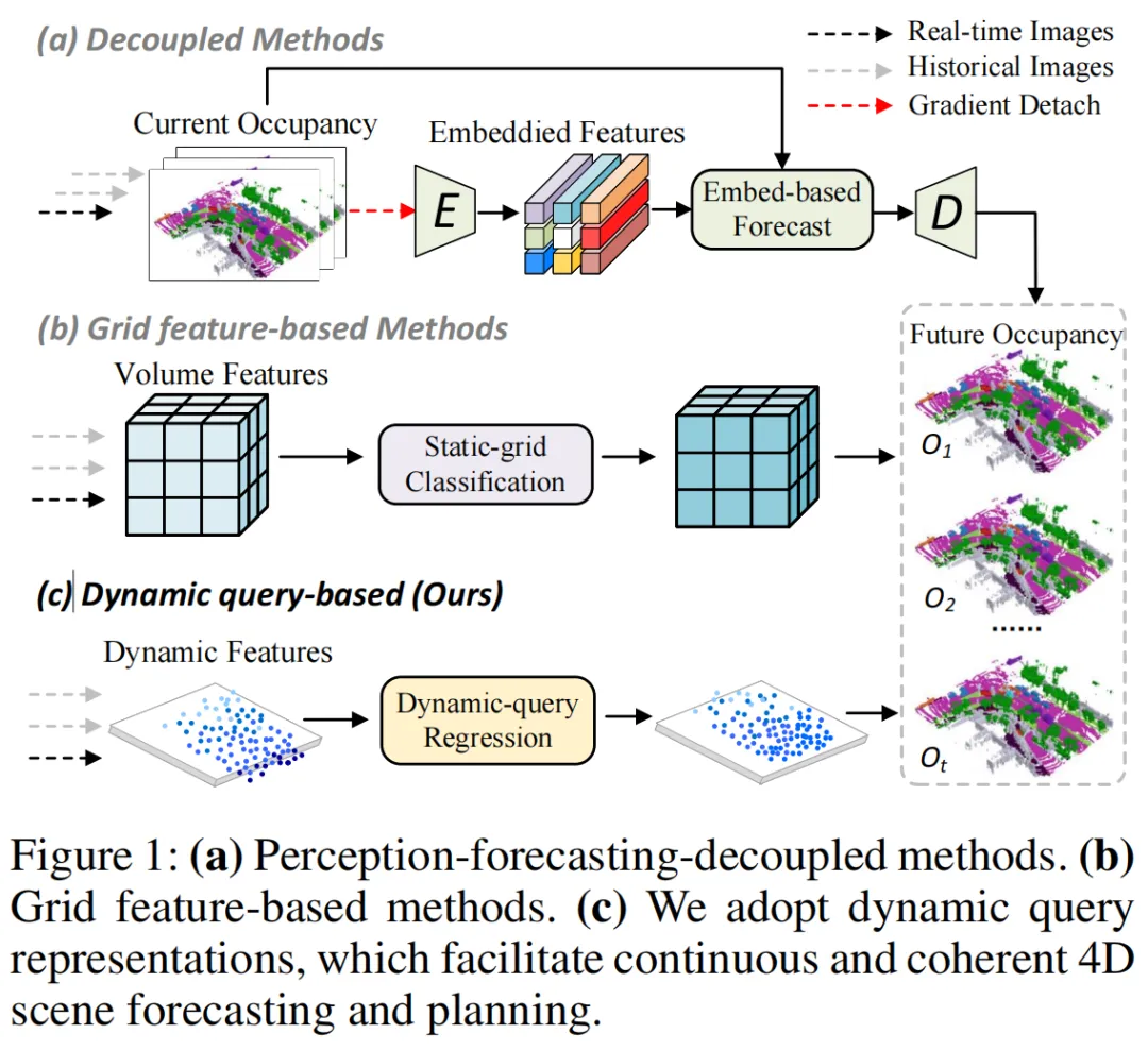 早期解耦式方法(如上图(a))将感知与预测分离,通过独立编码每一帧占用状态再融合预测,导致梯度流动受阻,难以端到端优化;而近期的网格特征方法(如上图(b))虽实现了端到端训练,但依赖人工预定义的空间范围,无法适应自动驾驶中车速剧烈变化的场景——高速行驶时需要更远的感知范围,低速泊车时则需聚焦近处细节,固定范围设计会导致预测精度下降或计算资源浪费。