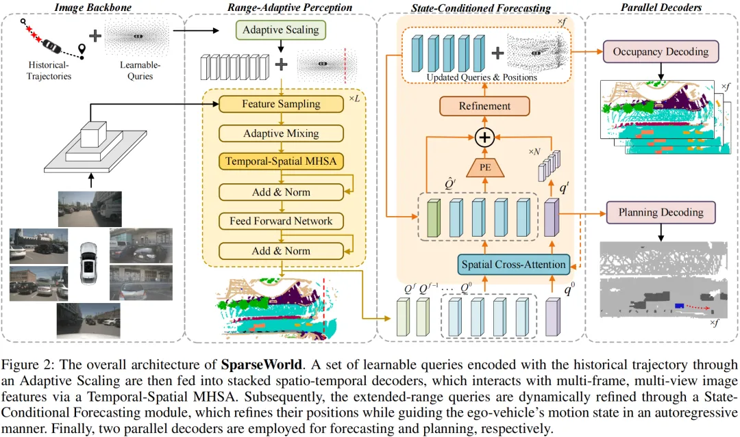 其整体架构如下图所示,主要包含四大模块:图像骨干网络、范围自适应感知模块、状态条件预测模块和并行解码头,辅以时间感知自调度训练策略。