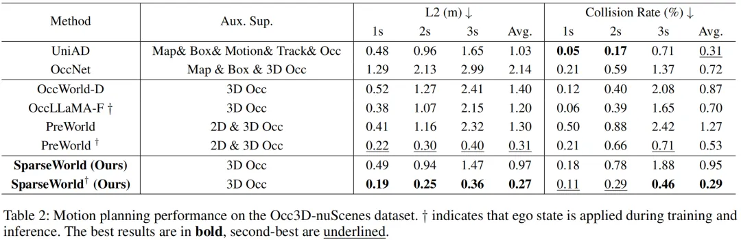 下表展示了运动规划任务的结果,SparseWorld在碰撞率和轨迹精度上均表现出色: