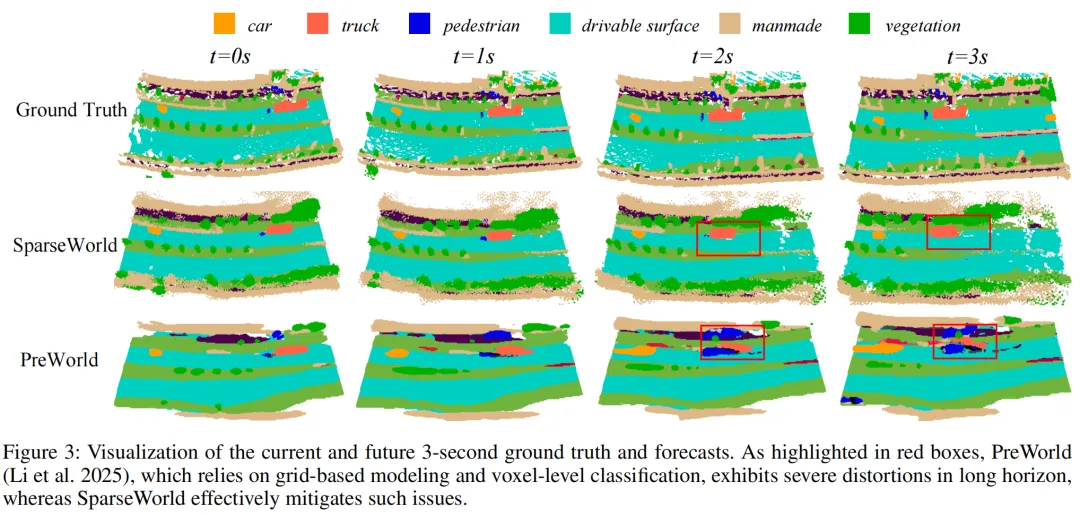 上图对比了SparseWorld与PreWorld在3秒长时预测中的表现。可以看到: