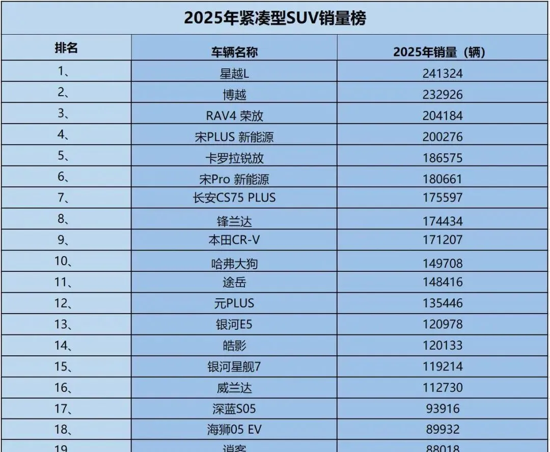市场热度不减,2025年有多达16款紧凑型SUV年销突破十万台。首先由星越L领跑,全年卖出241324辆。它在智能化配置方面下足功夫,同级别里产品力几乎高半阶。吉利在年初还推广了更多智能科技到燃油车型,这让星越L的销量像安装了加速器。紧随其后的是博越,232926辆的年度表现说明稳扎稳打有大市场。博越这两年在性价比和配置升级上都吃足红利,技术落点精准,也成了车市中的长期“常青树”。