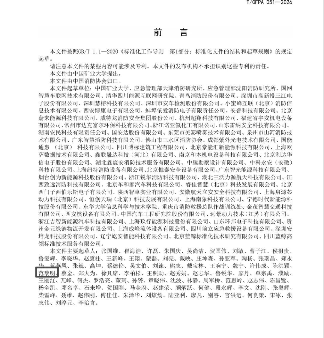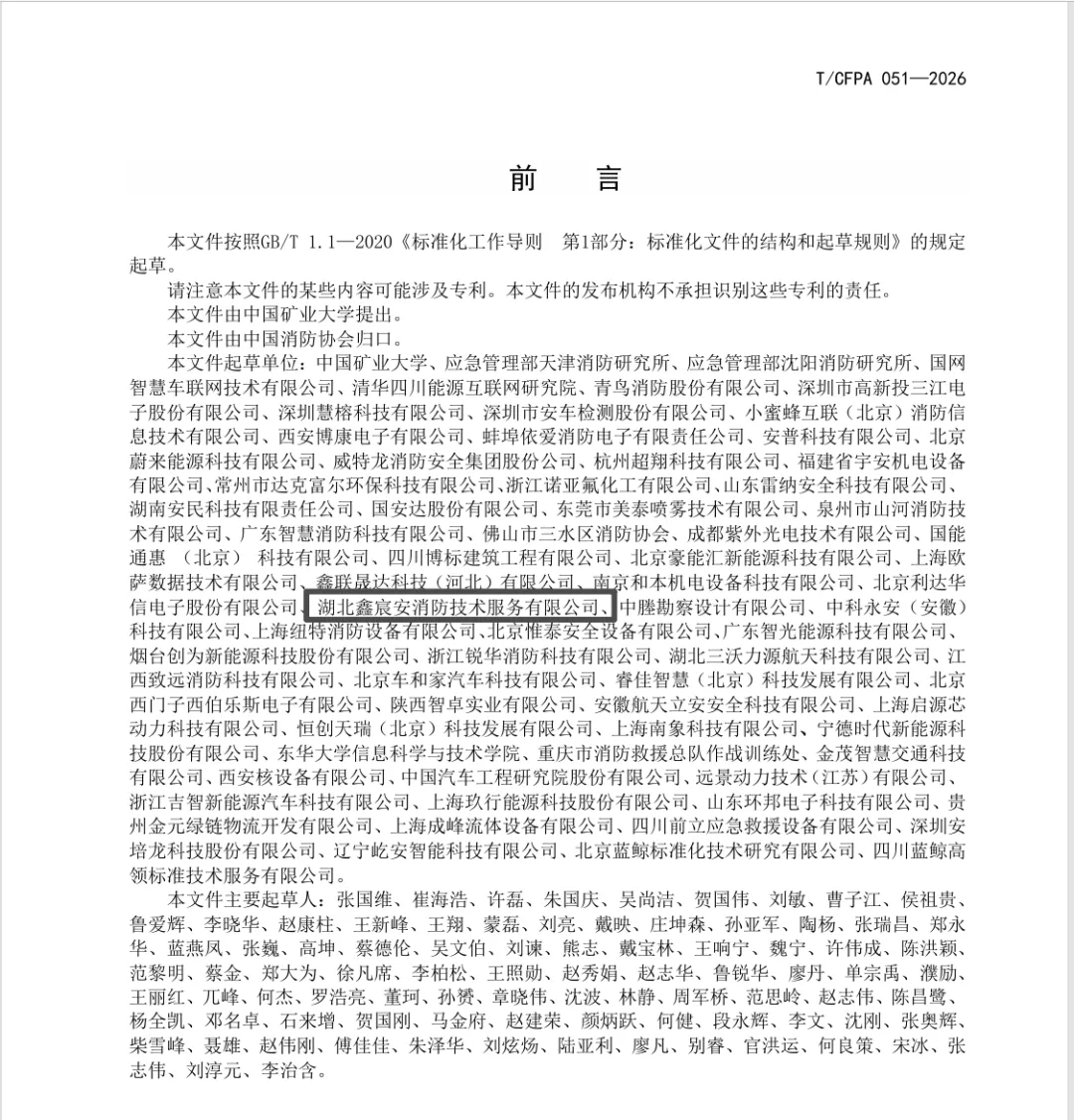 湖北鑫宸安消防技术服务有限公司成功加入中国消防协会团体标准《电动汽车充换电站消防安全技术规范》工作组,公司领导范黎明作为主要起草人之一参与了该团体标准编制的全过程。
