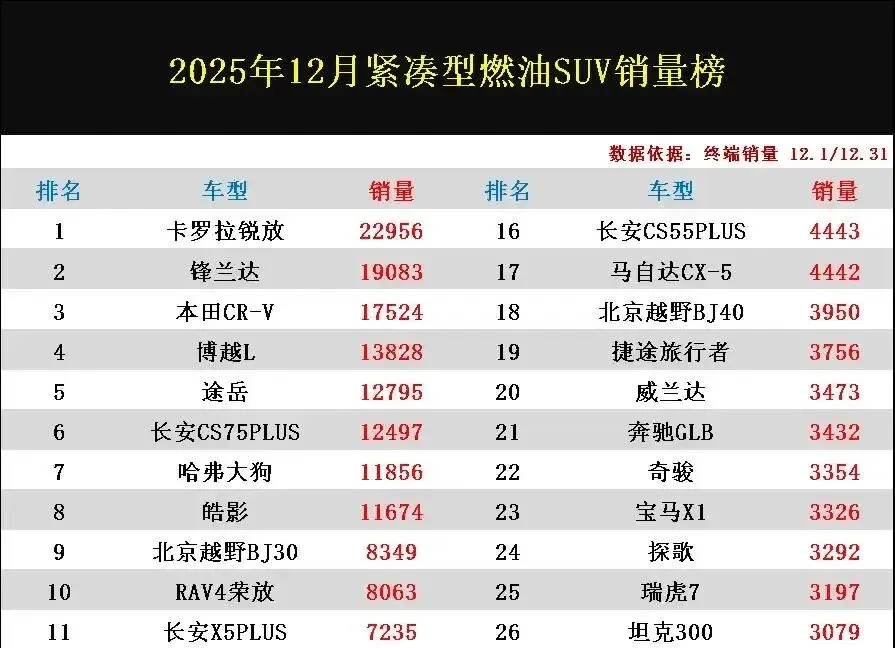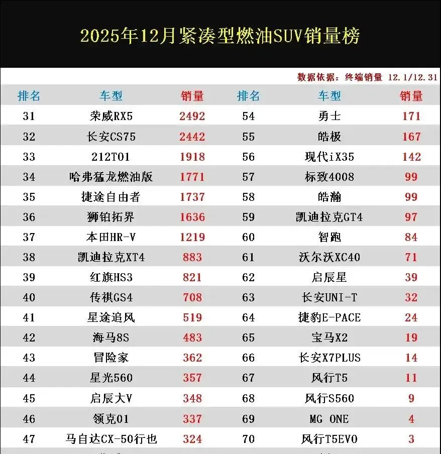 各位车友,咱今儿个不聊那些虚头巴脑的“电动爹”,专门来看看咱们老百姓实打实拿真金白银票选出来的2025年12月紧凑型燃油SUV销量榜单。