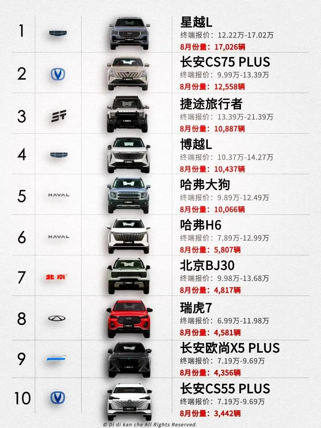 最让我意难平的还是当年的“国民神车”哈弗H6。这一看榜单,好家伙,直接掉到了第14名,月销才5000多辆。想当年这可是常年霸榜的老大,谁见谁不得叫声大哥?现在这销量跌得让人心疼。