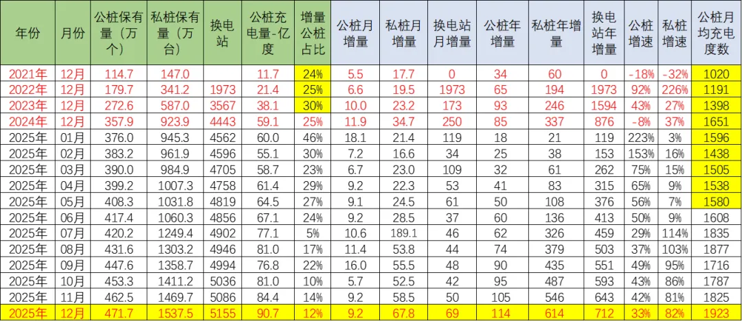 2025年12月的充电基础设施的公桩总量达到472万个,12月公桩数量较上月增长9.2万个,相对去年12月增量114万个。随车私桩目前有1538万个,12月较上月增长67.8万个;12月公桩单桩月均充电1923度,较去年12月1651度增长较好。
