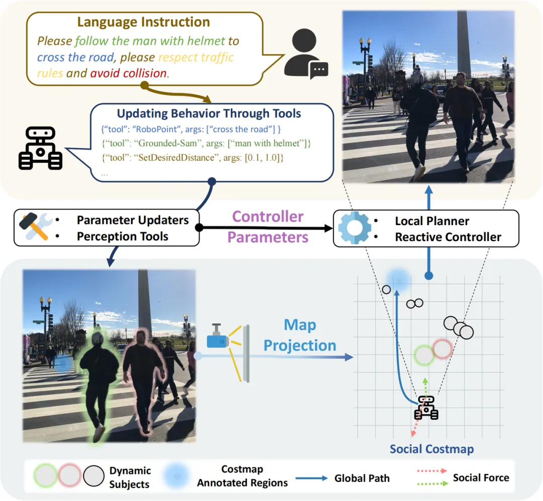 这一形式化的关键洞察在于:通过将代价函数 设计为语言条件的,系统可以将抽象的社交规范(如"小心""紧急""远离")转化为具体的代价权重调整,从而在不改变底层规划算法的前提下实现语义感知的导航行为。
