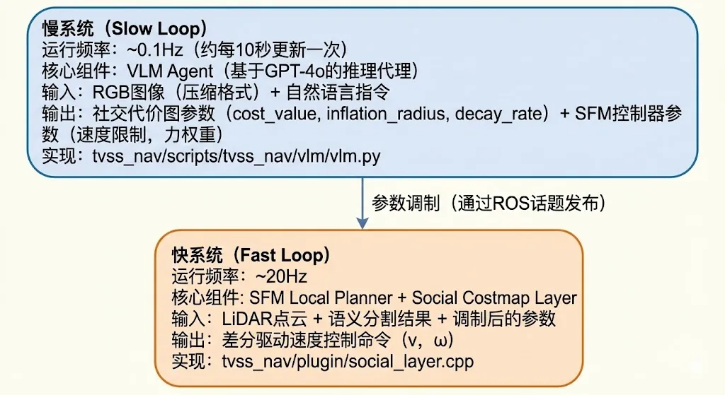 Social-Nav-Modulator采用创新的快慢分层架构设计,其核心设计理念源于一个关键洞察:如果将经典社交导航视为一个带约束的优化问题,那么可以使用VLM动态调制优化问题的输入参数和约束条件,使其与语言指令中蕴含的社交规范保持一致,而无需VLM直接参与高频控制决策。这种设计思路将VLM的角色从"控制器"转变为"调制器",巧妙地绕过了时域鸿沟的限制。