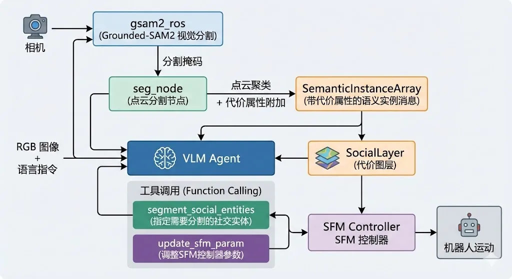 慢系统通过update_sfm_param工具动态调整权重参数 ,从而实现对机器人社交行为的高层语义控制。例如,当用户发出"紧急"指令时,可以增大 并降低 ,使机器人更激进地向目标移动。