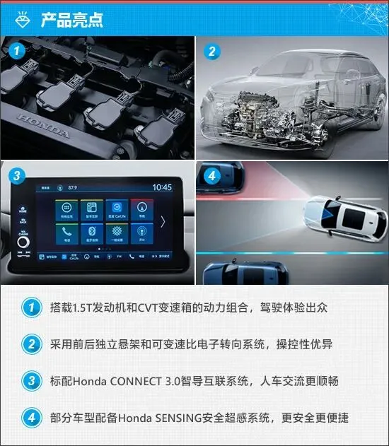 1.5T缸内直喷涡轮增压发动机配备涡轮电控电磁直驱执行器,省去了传统执行器中的齿轮中间传动环节,不仅能避免齿轮异常故障,提高发动机寿命,还能精准调节涡轮压力,提升动力响应速度。发动机最大功率134kW、最大扭矩240N·m。与发动机匹配的是本田优化钢带CVT变速箱,扭矩承载能力高达260N·m,兼顾平顺性和耐用性,有效避免CVT钢带断裂和顿挫的烦恼。