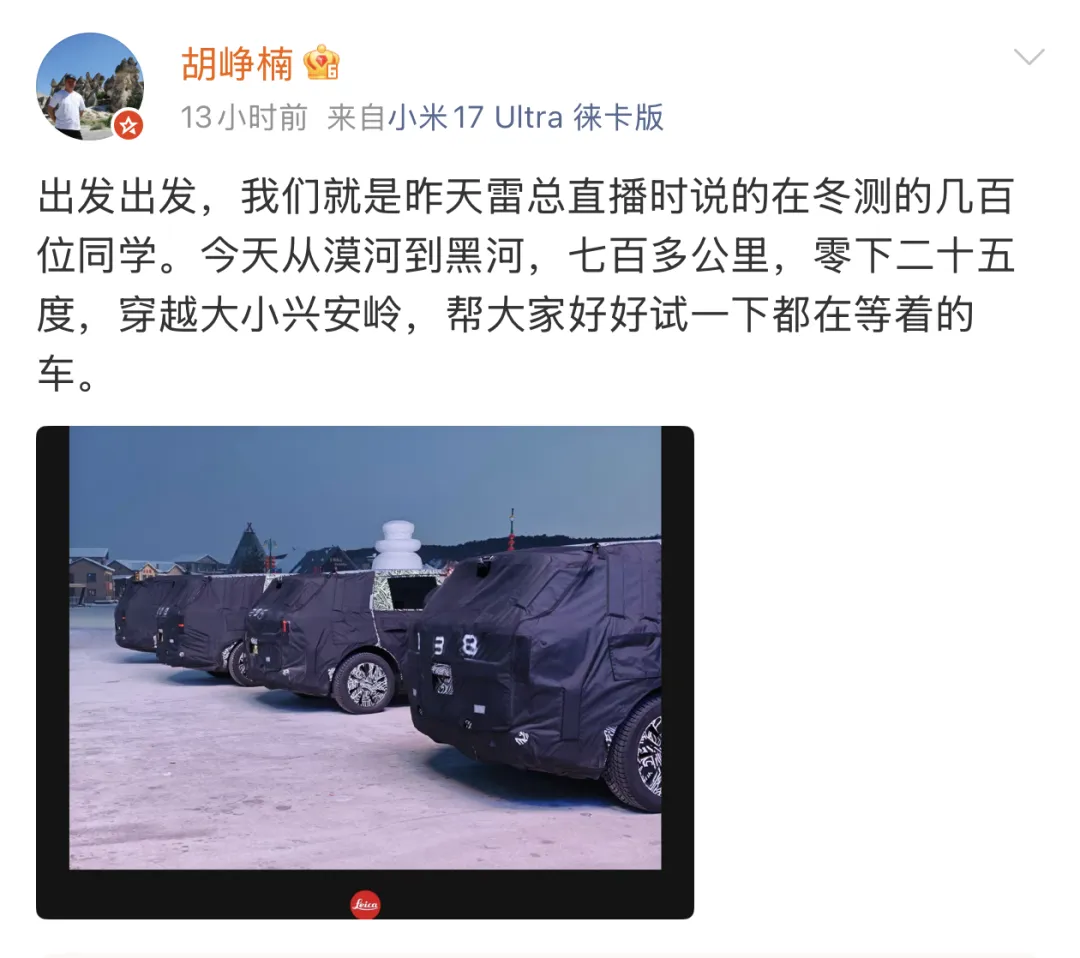 今天小米汽车高级顾问胡峥楠在社交平台发布了一张小米新车参与冬测的照片,并且表示帮大家好好试一下都在等着的车。