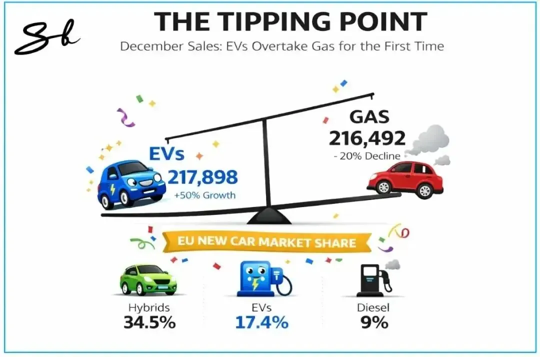 2025年12月,欧洲车市抛出一枚重磅炸弹:电动汽车单月注册量首次超越传统燃油车,这一跨越不仅改写了欧洲汽车产业百年格局,更标志着全球汽车电动化转型进入不可逆的深水期。这场看似偶然的销量超越,实则是产品、市场、政策三方共振的必然结果,而中国车企的强势突围,更让这场转型充满了新的博弈与可能。