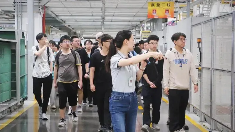7月4日,120名测控专业同学分两批乘车前往位于江北区渝康大道的赛力斯两江智慧工厂参观。该工厂按照“工业4.0”标准建设,检测精度可达5丝(相当于一根头发丝的直径),具备平台化、柔性化、透明化的生产线,曾获评2021年重庆“灯塔工厂”,是“中国领先,世界一流”的整车制造工厂。同学们在讲解员的引导下依次参观了冲压、焊接、涂装、总装四个车间,系统全面的了解了智能汽车从钢板到整车的生产全过程。
