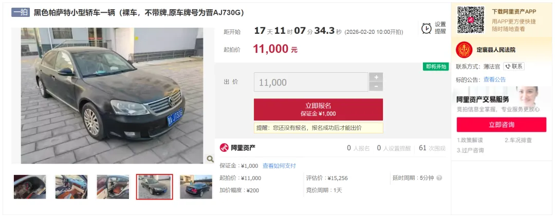 一、拍卖标的物:黑色帕萨特小型轿车一辆(裸车,不带牌,原车牌号为晋AJ730G),基本信息:号牌种类:小型汽车;号牌号码:AJ730G;排量/功率1781ml/120kw;行驶里程187634km(详见实表);车辆型号SVW7183SJD;车辆类型:小型轿车;车辆识别代号:LSVET69F7A256;发动机号061995;车身颜色:黑;使用性质:非营运;出厂日期:2020-09-30;检验有效期至:2010-01-17;燃油种类:汽油;核定载客数:5人;发动机型号:CED;总质量:1897KG;机动车所有人:赵某;处置参考价:10400元、20112元,起拍价:11000元,增价幅度:200元(及其整数倍),保证金:1000元。