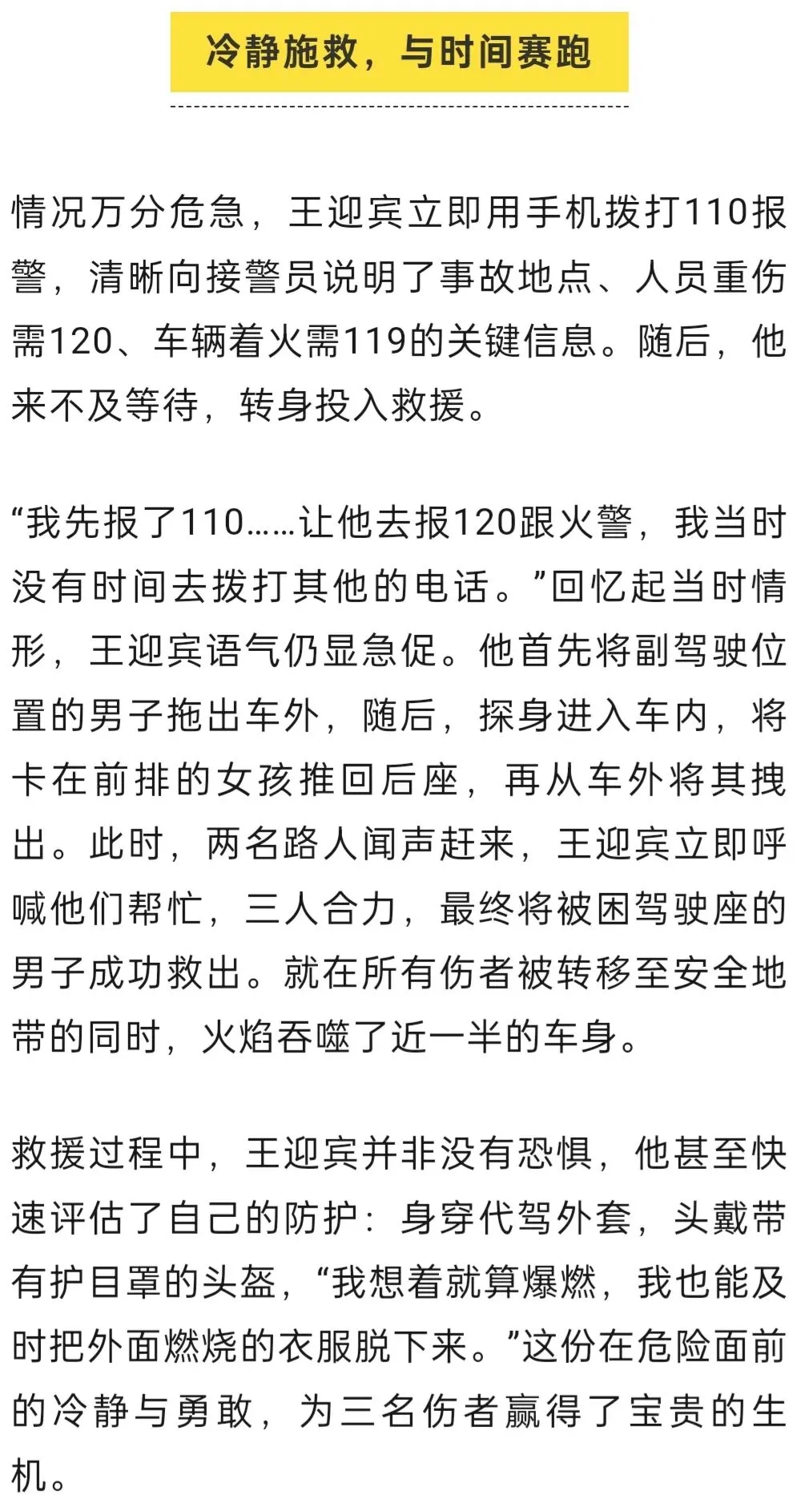 他迅速奔向事故现场,发现一辆撞在红绿灯柱上的轿车:车头至前挡风玻璃位置已严重变形,车内已有白烟和明火窜出。王迎宾靠近查看,发现车门未被锁死,可以打开。车内共有三人:驾驶员为一名年轻男性,面部有血,趴在弹出的安全气囊上;副驾驶人员头部受伤;后排一名女孩因撞击被甩至前排座椅之间。