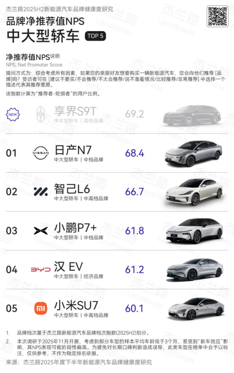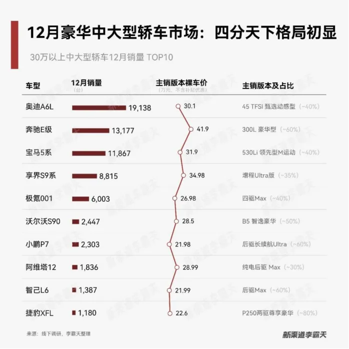 在最近发布的12月汽车销量数据中,中大型轿车市场颇有看点,奥迪A6L、奔驰E级、宝马5系“三剑客”实现霸榜,老将风采依旧。但值得关注的是紧随其后的中国品牌“新生势力”,小米SU7、风云A9L表现稳健,长安启源A06增势明显,但其中最亮眼的黑马当属享界S9系,价位正面对标BBA,却能凭借自身实力,以8815台的成绩强势逼近BBA主场地位。这一成绩的取得并不简单,要知道,享界作为车市“新面孔”,承载的是中国品牌筑基豪华车市场的重任。在鸿蒙智行和北汽的强势背书下,享界S9一上市就以越级豪华品质精准定位精英人群,凭借华为途灵平台、华为乾崑智驾ADS4、800V碳化硅平台、鸿蒙座舱等硬实力,夯实30多万越级产品力基础,成交价仅次于奔驰E级,并且获得了40%女性用户的青睐。在豪华车市场,用户看重的是品牌价值和品质享受,享界不像BBA那样有着长久以来的市场铺垫,想要突出重围,就要靠硬实力。先行面世的享界S9不仅在三大件底层方面有着扎实的产品实力,在配置享受上更可谓是“超豪华”的存在。像是座舱的十屏互联、舒适的Nappa真皮座椅、25扬声器高级音响、鸿蒙ALPS健康座舱等等,相比“56E”来说具备不可替代的独特优势。增程纯电可选、3.92s的加速能力、全维防碰撞系统,还有动静自如的豪华底盘,让享界S9有着通吃市场的资本,上市2小时大定超2000台就是最好的证明。随后,更懂生活的享界S9T,凭借拉满的配置和更加灵活实用的空间表现,掀起精英群体的“悦己”风潮,上市66天大定超30000台,比传统旅行车一年销量还多,把“小众”硬生生卖成了“大众”,堪称行业奇迹。享界S9系的成功印证了豪华市场全新时代的开始,以前大家买豪华车图的是品牌、是面子、是社交圈子,而现在,大家更看重内涵、看重价值、看重获得感,很多享界S9系的车主都是在了解和体验过产品之后,随即萌发出购车需求的。NPS净推荐值不会说谎,独立新能源汽车数据分析机构杰兰路发布的《杰兰路2025年度下半年新能源汽车品牌健康度研究》中,享界S9T摘得中大型轿车净推荐值第一名。调查显示,享界的“高档感”与BBA处于同一竞争视野之中,这足以证明精英用户们对它的高度认可,英雄所见略同。成绩背后总有着我们看不到的努力,享界的产品之所以被精英用户们推崇,除了自身产品力舍得下料,还源自于刻在骨子里的高品质。在投入超过20亿的北汽享界工厂,每一颗螺丝都体现出匠人精神,冲压产线精度控制在±0.3mm以内,车身连接精度更是控制到±0.06mm的发丝级精度,并借助AI技术实现全自动高精尖装配,出厂产品零缺陷。权威报告更能说明问题,杰兰路调研显示,享界品牌正在被更多的用户所认可并熟知,除了“百人青睐指数”显著提升,在“品牌档次指数”维度也已完全对齐BBA所属的高档阵营,很多用户都是从BBA转到享界的,占比高达70%以上。同时,“智能”也成为大家最认可它的标签之一,这也是享界的核心竞争优势。“华为+北汽”大厂背景让用户心中增添了一份信赖,并对享界的发展寄予厚望,给出了强信心级指数。