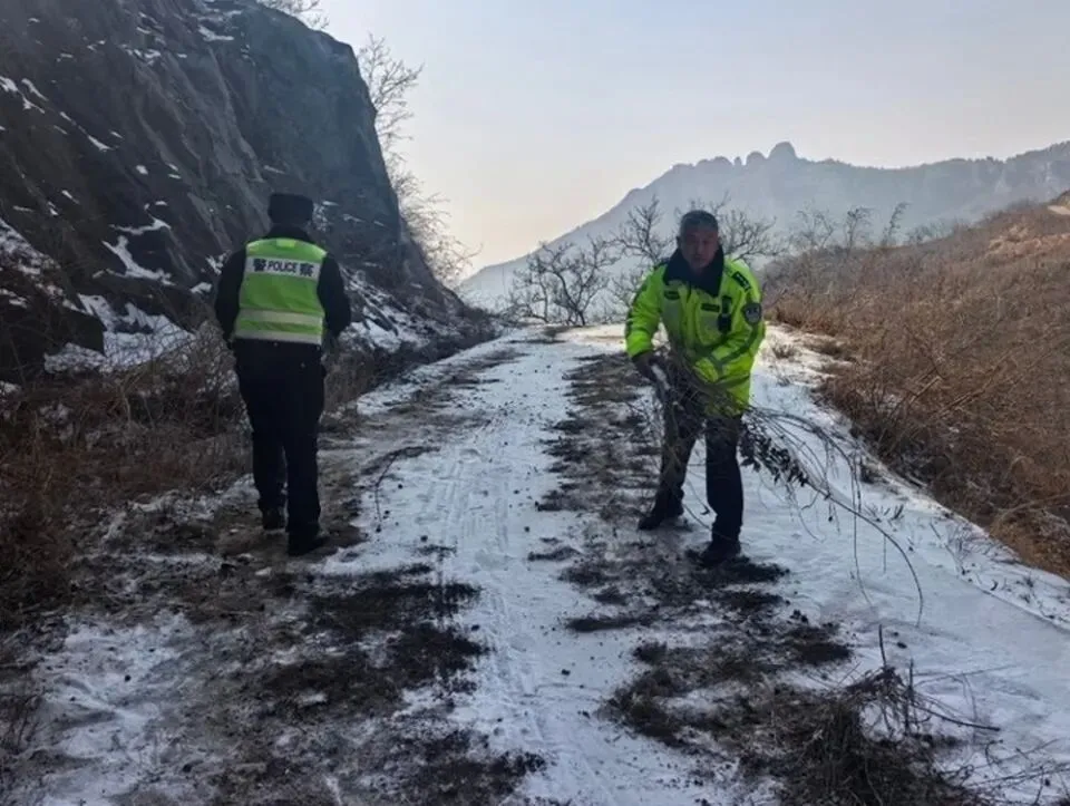 随后,通过现场观察,民警发现遇困车辆位于山坡之间,只有翻过前方近百米坡道才可顺利前行。但这段坡道积雪未融化且有结冰。于是,民警不顾天寒地冻,立即动手将路旁杂草树枝、砂石铺在路面。几个人一起用了近两个小时才把路面铺好。民警担心驾驶人不敢开车前行,便自己驾车并嘱咐同事准备好大点的石头,遇有滑行等紧急情况立即放到车轮下。近百米的山坡,一名民警驾车慢慢前行,另一名民警手抱石头在旁边保护。