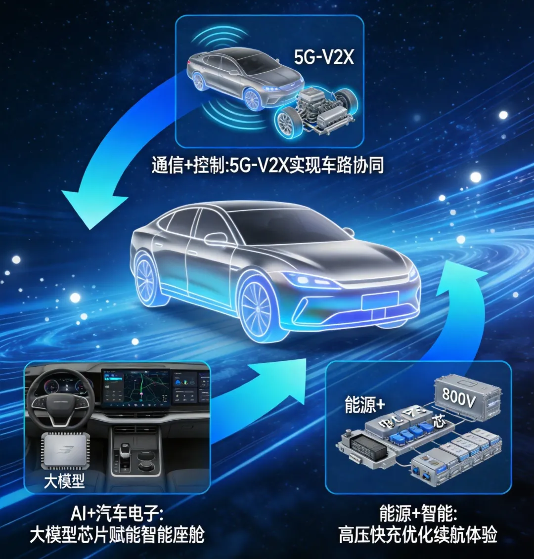 产业协同正在催生AI+汽车电子(大模型赋能智能座舱与自动驾驶)、通信+控制(5G-V2X实现车路云一体化)、能源+智能(800V高压平台与智能驾驶深度融合)三大方向技术的深度融合